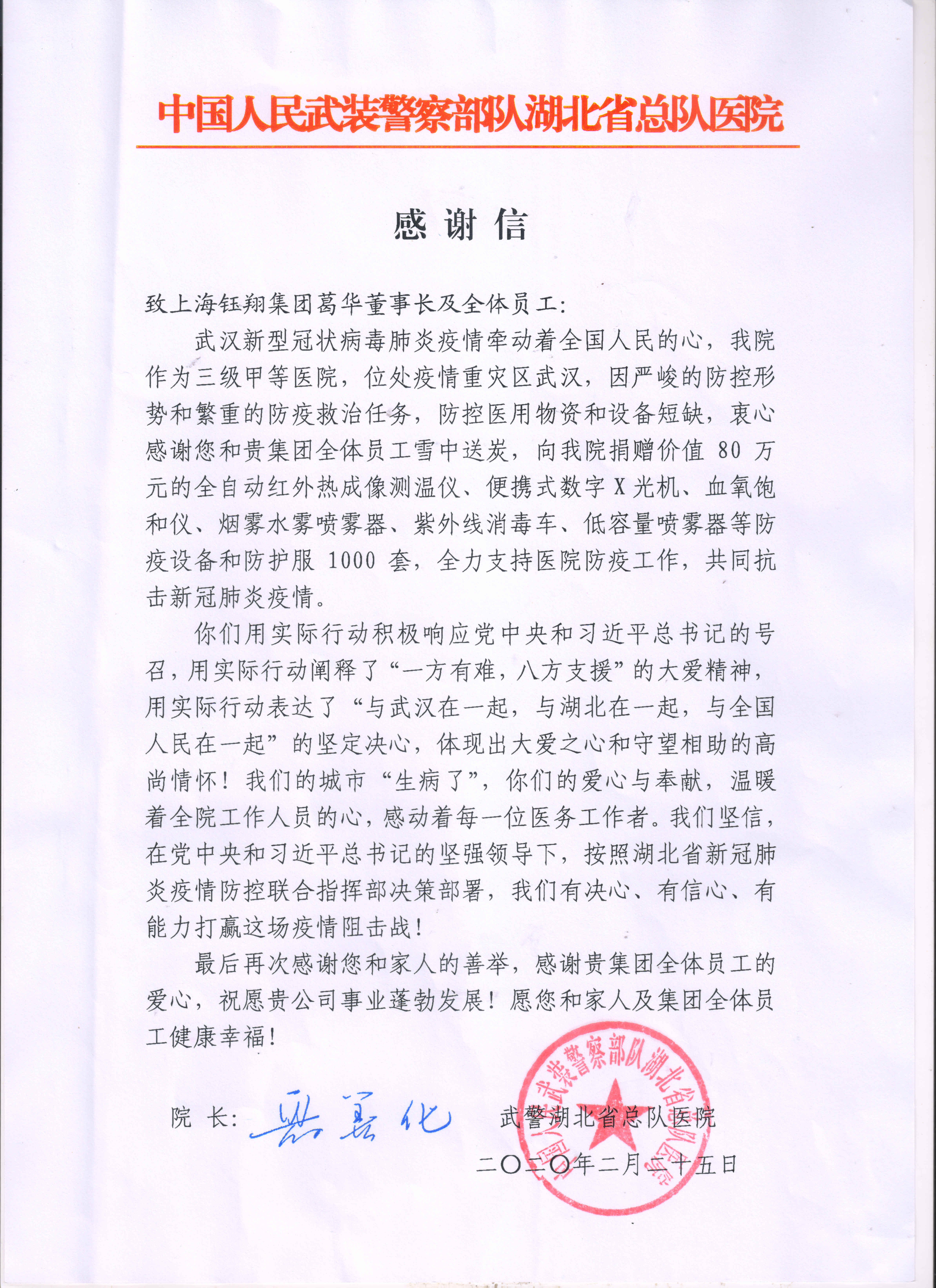 在收到此批捐贈物資后,武警湖北省總隊醫院第一時間向鈺翔控股集團發來了感謝信。