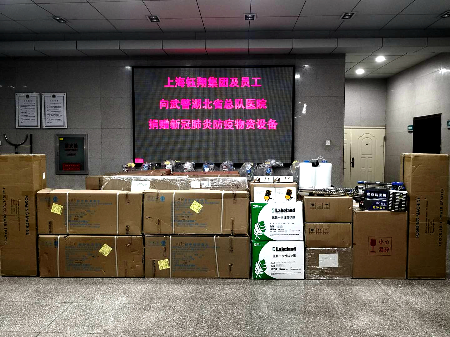 2月24日,鈺翔控股集團員工及企業捐款80萬元購買的第二批抗疫醫療物資送達武警湖北省總隊醫院,此批物資包括熱成像人體測溫系統、便攜式數字X光機、掌式脈搏血氧飽和度儀、電動噴煙器、紫外線消毒車、電動超低容量噴霧器及防護服等。