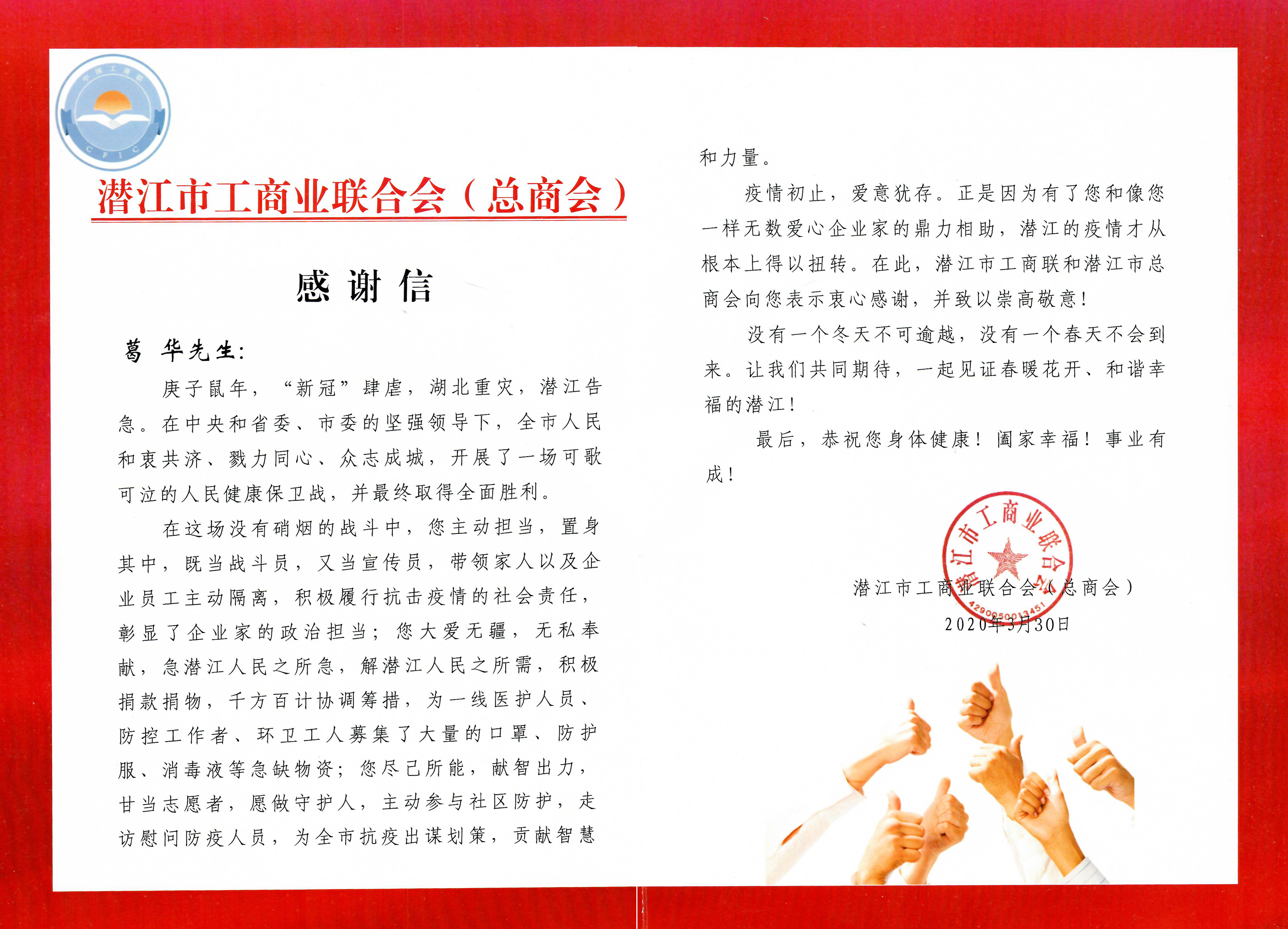 潛江市工商業聯合會(總商會)感謝信